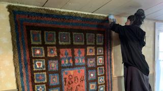 Oona Rohde tutkii Övre Nybackan seinällä roikkuvaa toisintoa Martinkylän ryijystä. Kuva: Päivi Yli-Karhula, Vantaan kaupunginmuseo