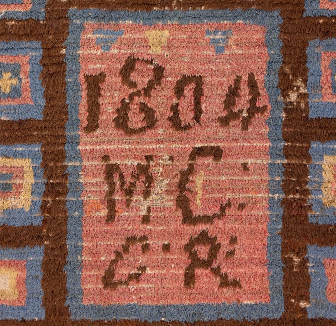 Nimikirjainten pisteet on sijoitettu erikoisesti kirjainten yläreunaan. Myös kaksoispistettä on käytetty. Ammattikutojat eivät signeeranneet töitään. Kuva: Leena Haley, Vantaan kaupunginmuseo.