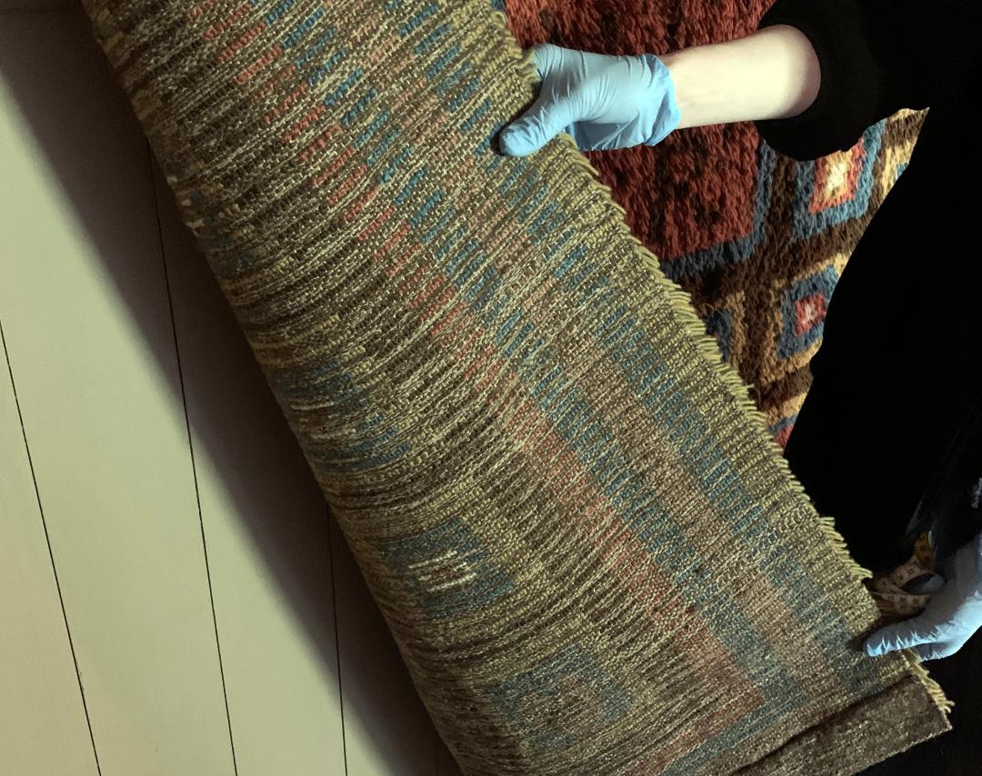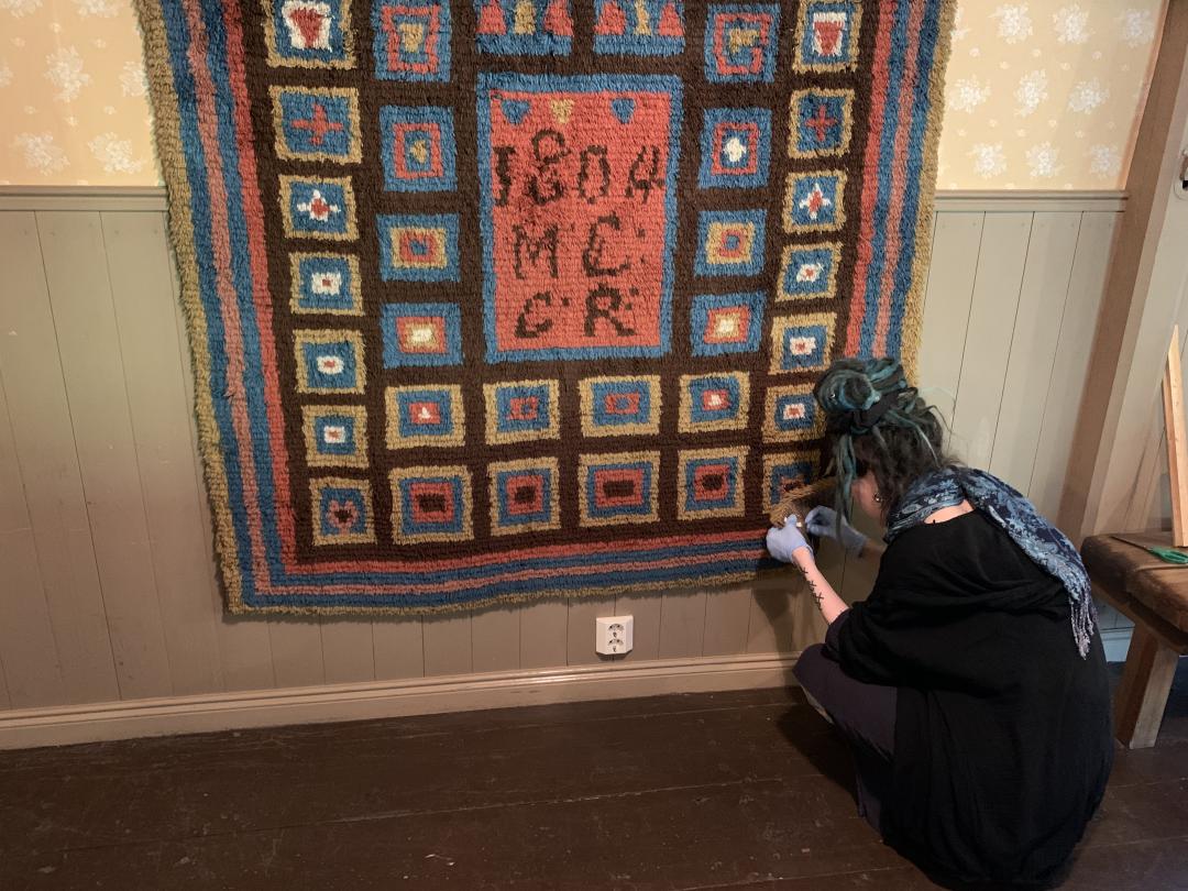Inventaarionumeron eli esineen tunnistenumeron ompelua ryijyn nurjalle puolelle. Övre Nybackaan, Vantaanlaakson historialliseen talonpoikaismiljööseen sijoitettu tekstiili on osa elävää käsityöperinnettä. Kuva: Päivi Yli-Karhula, Vantaan kaupunginmuseo.